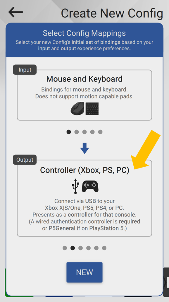 Next, choose your inputs and outputs. For a PlayStation 4 Config, the output must be Controller (Xbox, PS4).